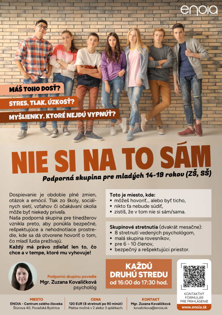 Dospievanie je obdobie plné zmien, otázok a emócií. Tlak zo školy, sociálnych sietí, vzťahov či očakávaní okolia môže byť niekedy priveľa. Naša podporná skupina pre tínedžerov vznikla preto, aby ponúkla bezpečné, rešpektujúce a nehodnotiace prostredie, kde sa dá otvorene hovoriť o tom, čo mladí ľudia prežívajú. Každý má právo zdieľať len to, čo chce a v tempe, ktoré mu vyhovuje.